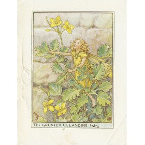 Greater Celandine Flower Fairy vintage print from ‘Flower Fairies of the Wayside’ by Cicely Mary Barker, first published 1948. All Flower Fairies are accompanied by a Frontispiece guarantee certificate. Each print is ready for framing, mounted in an antique white conservation quality mount measuring 10x8 inches. A ready to frame gift.